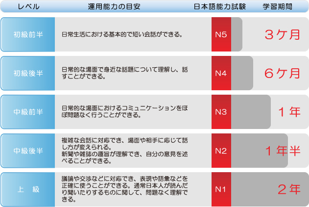 日本語能力による 入門:4月または10月 初級~上級(4月~2月 随時) |